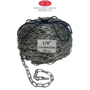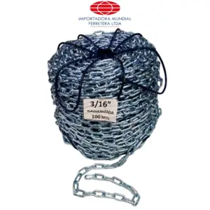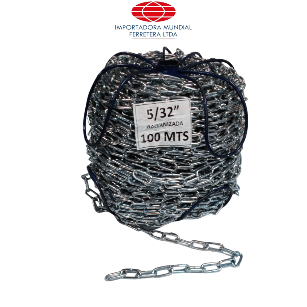 CADENA ESLABONADA GRADO 30 Calibre:5/32"-3.9 mm Ancho Int:7.5 mm Largo Interno 23.9 mm Carga De Trabajo: 170 kg Peso x metro:0.27 Peso Rollo 27 KG