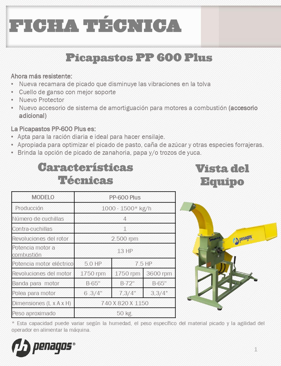 La picadora de pasto PP 600 PLUS, es ideal para optimizar el picado de pasto, caña de azúcar, sorgo y otras especies forrajeras; brinda la opción de picado de zanahoria, papa y/o trozos de yuca. Posee cuatro cuchillas móviles y una contra cuchilla fija, base para motor eléctrico o de combustión, cuenta con un protector de bandas y poleas y cuello giratorio para direccionar el material picado.