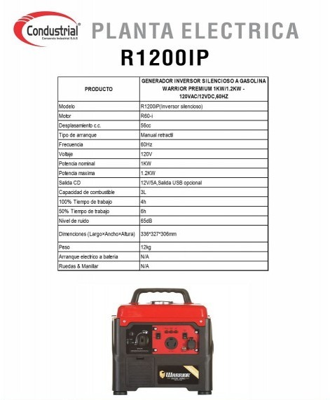 GENERADOR INVERSOR SILENCIOSO A GASOLINA WARRIOR PREMIUM 1KW/1.2KW – 120VAC/12VDC,60HZ